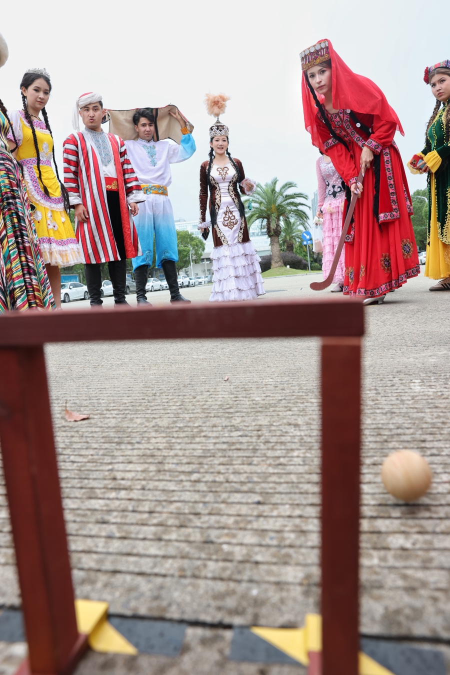 大学生在民族特色文化展示和民族游戏互动体验区打门球。
