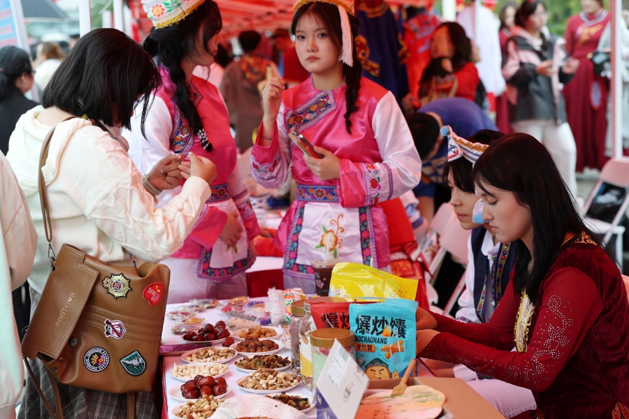大学生民族特色文化展示和民族游戏互动体验区玩游戏。