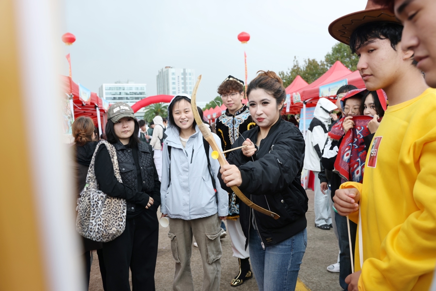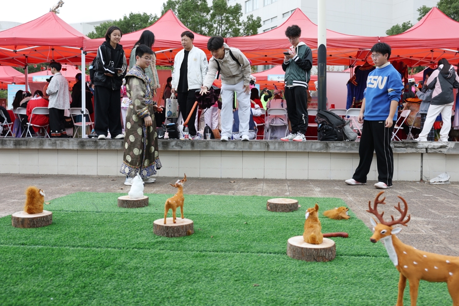大学生在民族特色文化展示和民族游戏互动体验区玩射箭游戏。